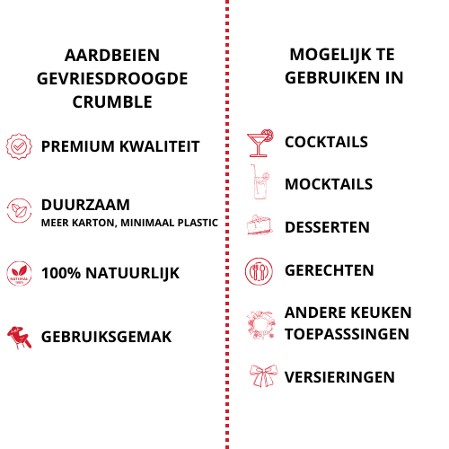 - Crunchy texture: The freeze-dried strawberry crumble adds a pleasant crunch to your dishes, ideal as a topping for all kinds of recipes.